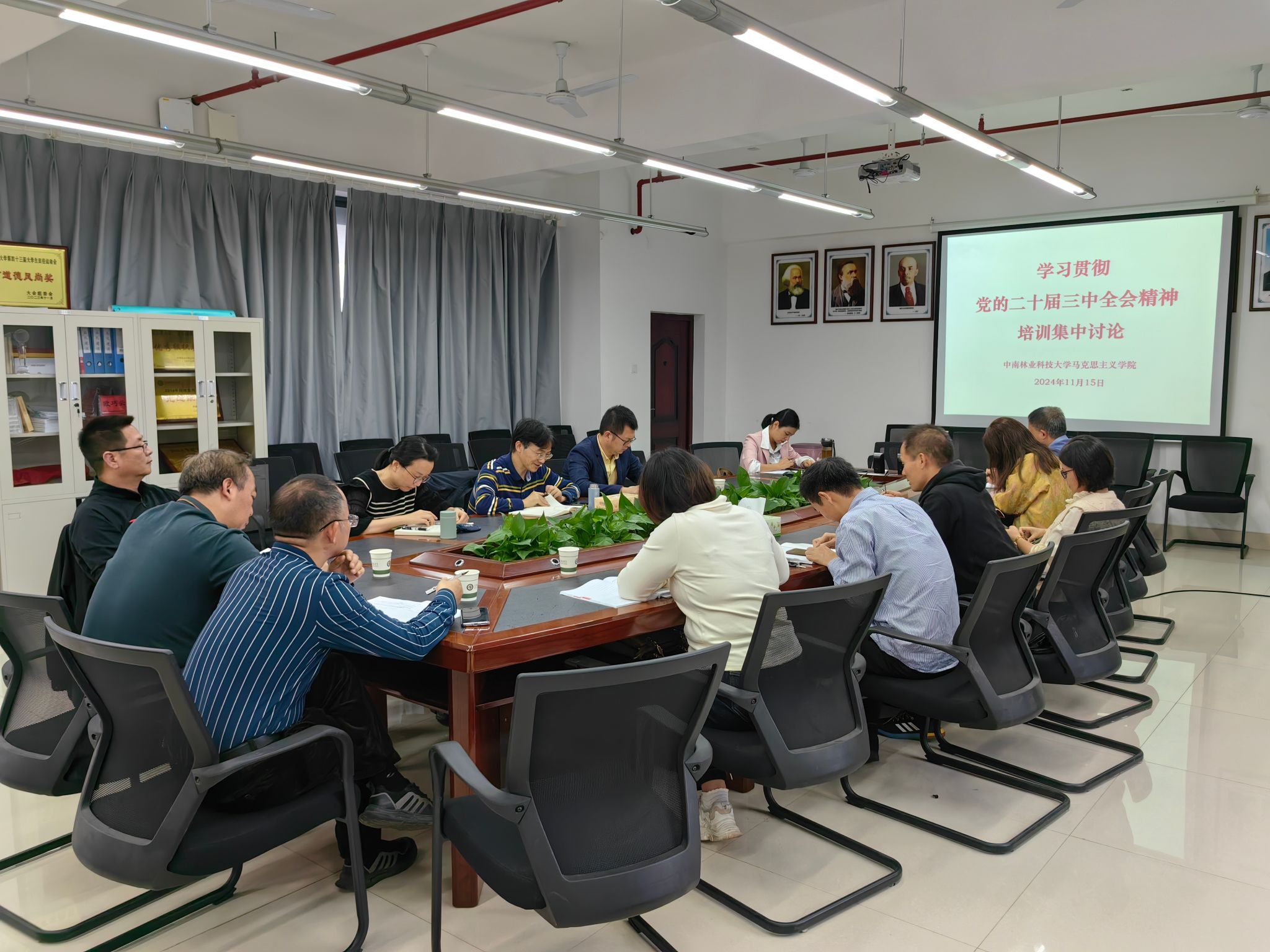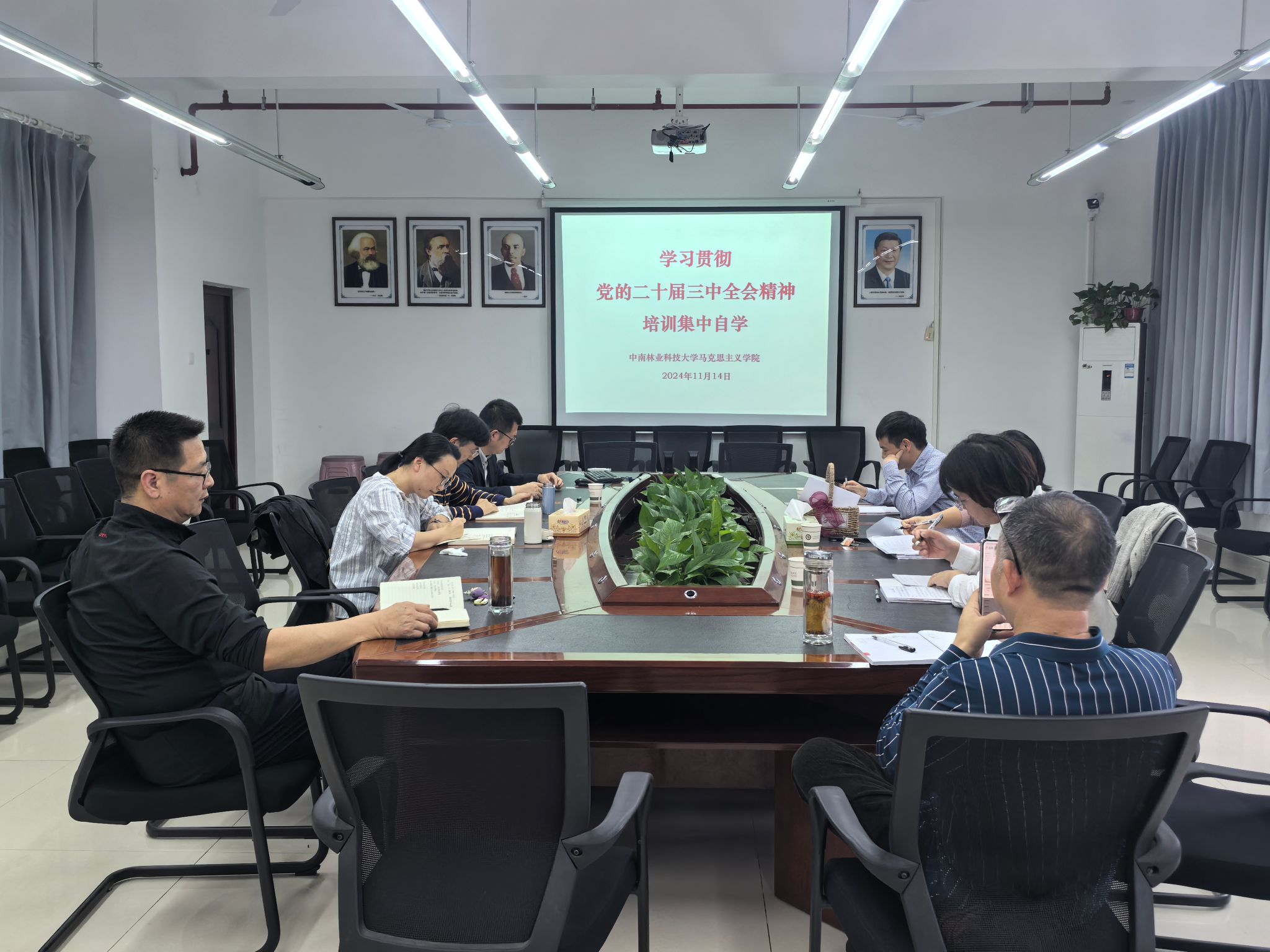 2024年11月14日至15日,马克思主义学院党委理论学习中心组在博文楼南1010会议室举行了“学习贯彻党的二十届三中全会精神”专题培训研讨会,会议分为“学习贯彻党的二十届三中全会精神培训集中自学”及“学习贯彻党的二十届三中全会精神培训集中讨论”两个部分。党委书记邓集文主持并发言,党委委员、各支部书记及教研室主任参加学习。