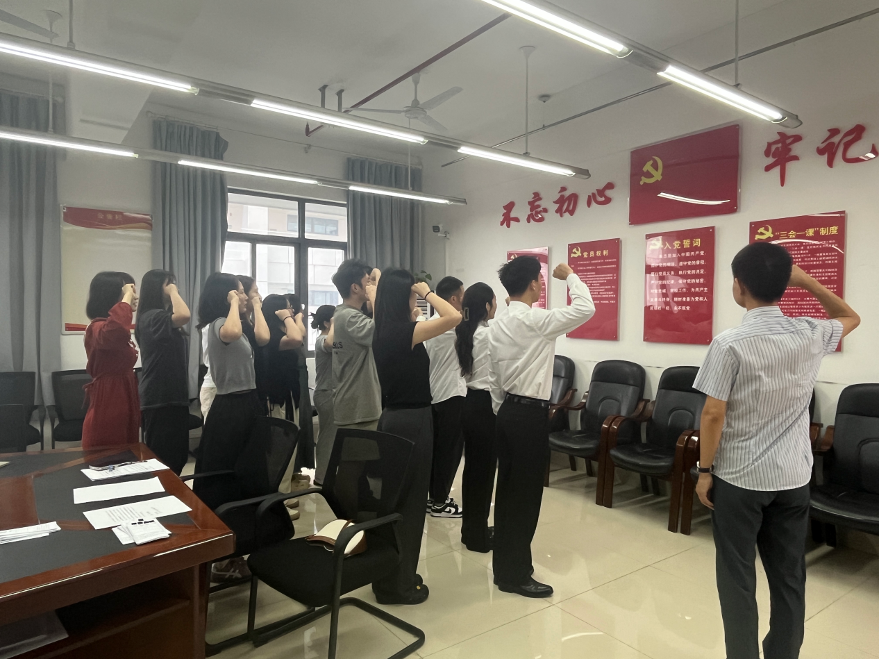 2025年5月29日,研究生党支部在博文楼南1010会议室隆重举行新接收预备党员宣誓大会。党支部书记佘凯旋老师与支部全体党员共同见证这一庄严时刻。