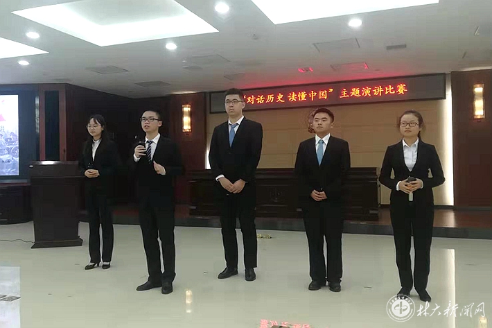 2019年11月22日晚,博文楼模拟法庭不时传出慷慨激昂的演讲,引发阵阵掌声,“对话历史·读懂中国”主题演讲比赛正在火热进行中。该活动由马克思主义学院主办,《中国近现代史纲要》课教研室承办,近300个座位的比赛现场座无虚席,来自全校108个班级的学生代表和马克思主义学院《中国近现代史纲要》课教研室全体教师全程观看了比赛。评委由各教研室主任担任。