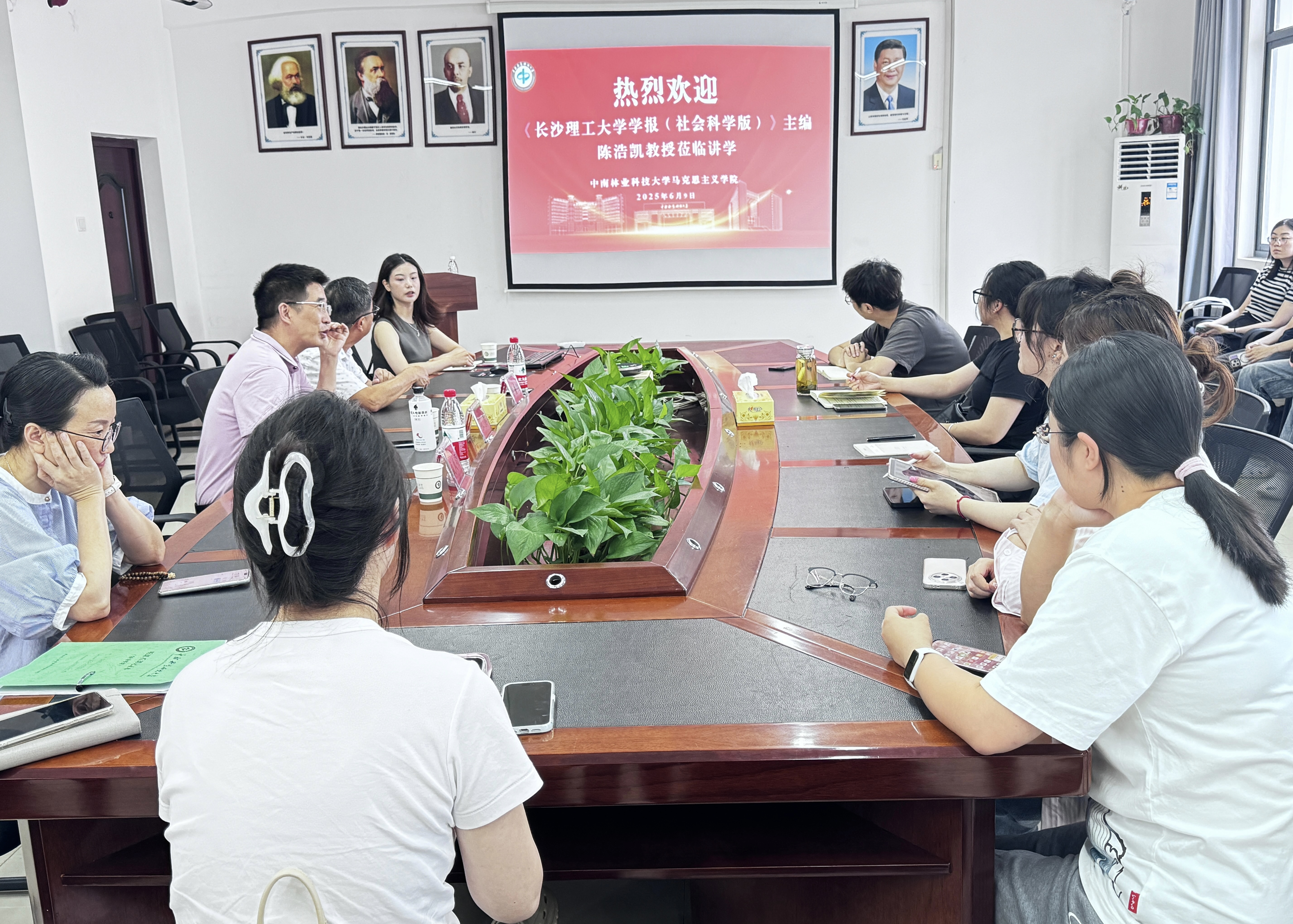 6月9日下午,《长沙理工大学学报(社会科学版)》主编陈浩凯教授应邀莅临我院作题为“学术论文的选题与写作”的专题讲座,马克思主义学院党委副书记张赓,副院长孙欢、姚遥,《中南林业科技大学学报(社会科学版)》前副主编成凤明,以及学院教师代表和在校研究生参会,学院党委副书记张赓主持讲座。
