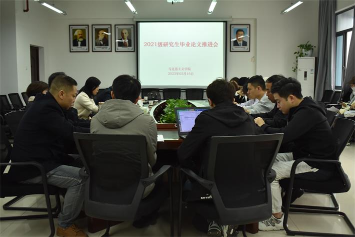 为推进研究生毕业论文工作,加强研究生学习教育,3月17日,马克思主义学院召开2021级研究生毕业论文推进会,学院副院长邓集文教授主持会议,马院全体硕士生导师、2021级全体硕士研究生参加会议。