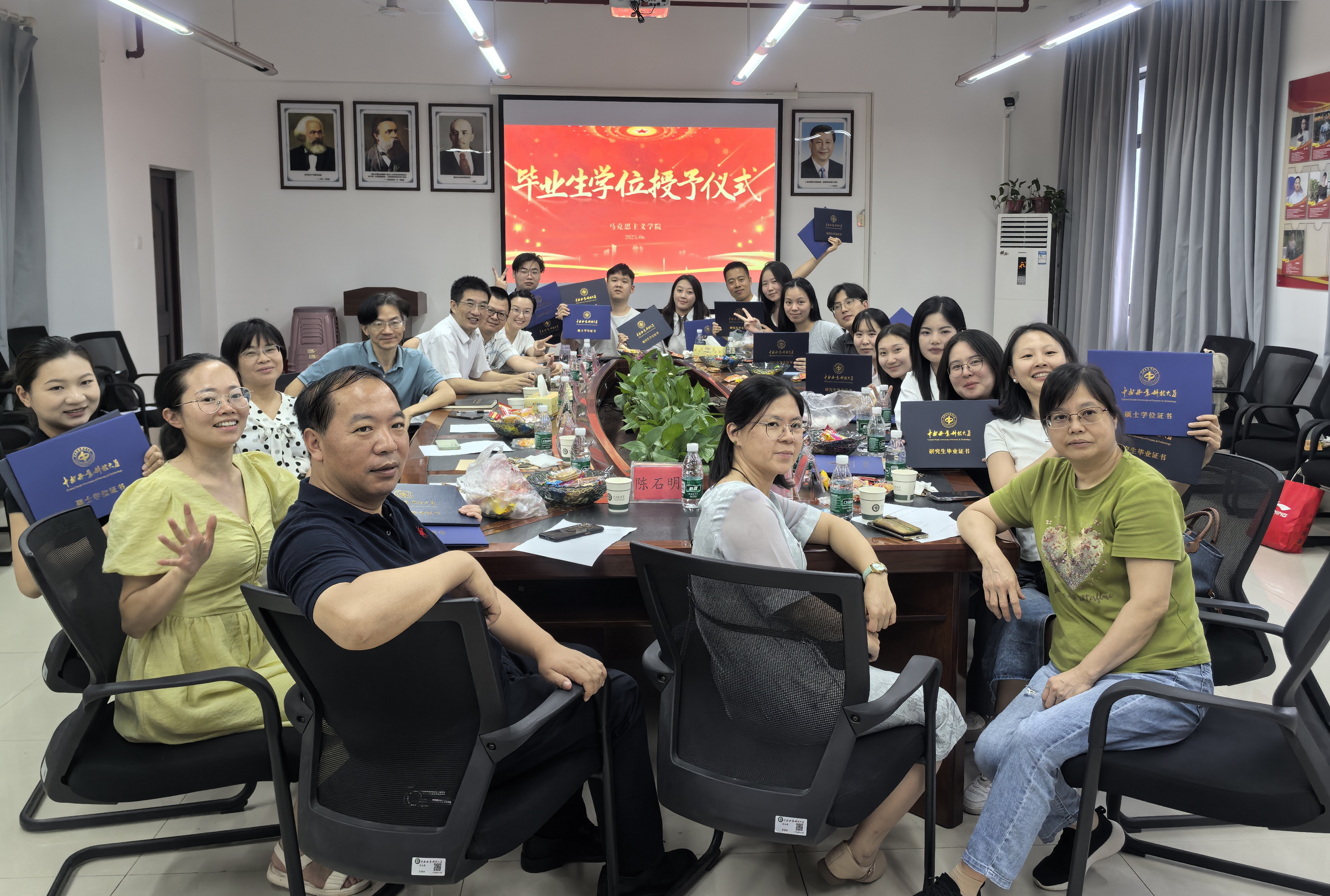6月11日下午,我院在博文楼南1010会议室举行2025届硕士研究生学位授予仪式暨毕业座谈会。学院党委书记邓集文,党委副书记张赓,副院长孙欢、姚遥,硕士生导师杨鑫铨、徐保风、陈石明,团委书记刘菁,研究生秘书尹雪文,以及2025届全体毕业生和2023、2024级研究生代表参会。会议由副院长姚遥主持。