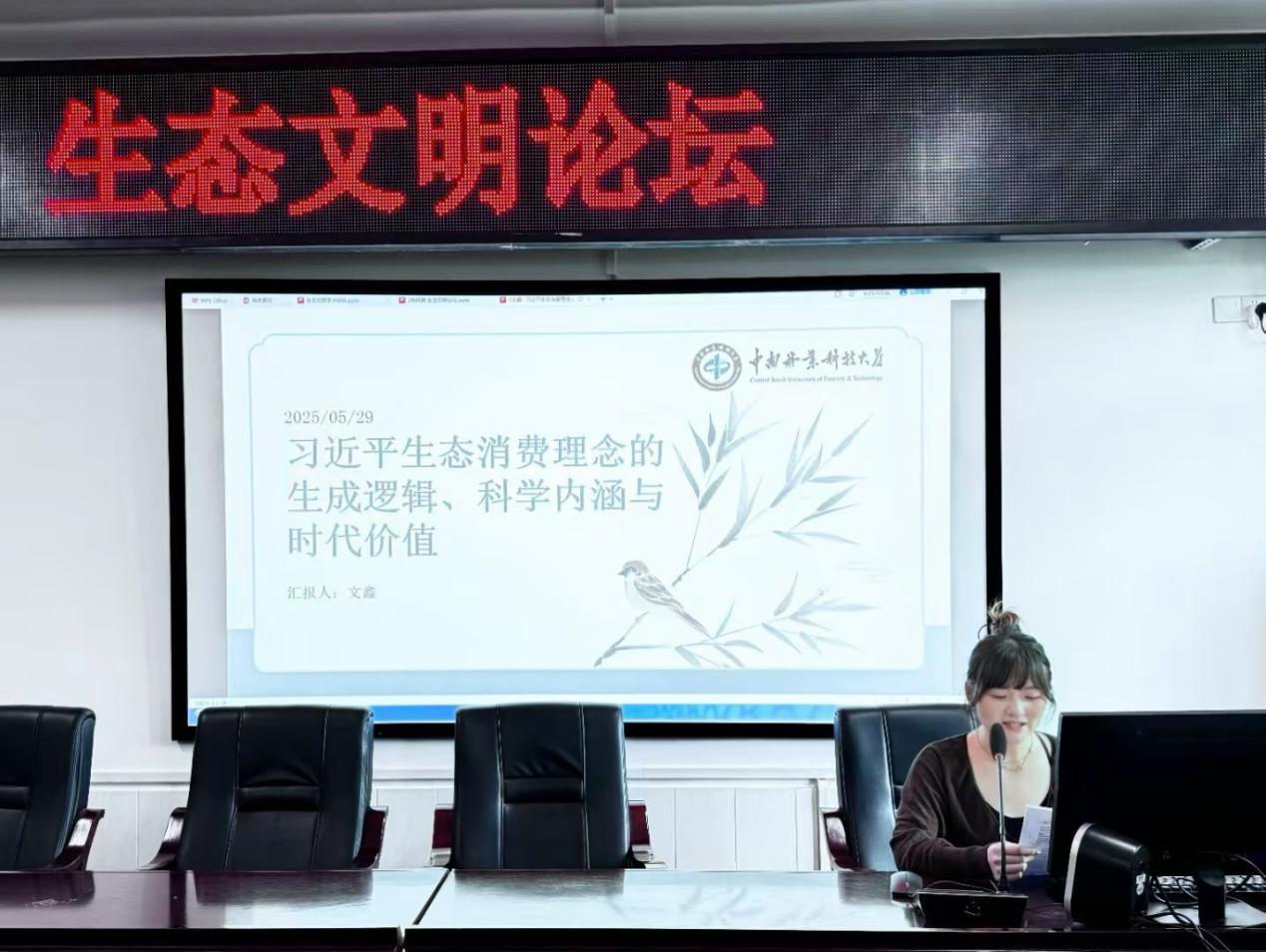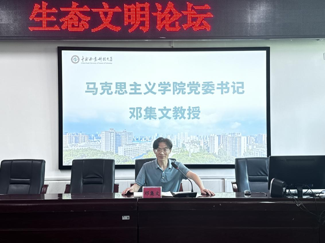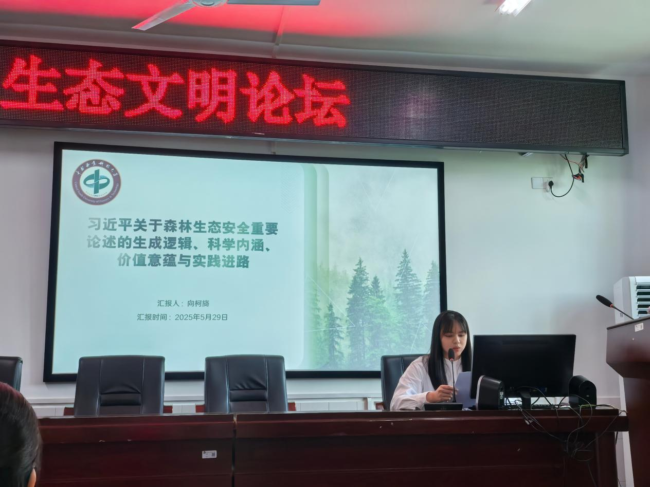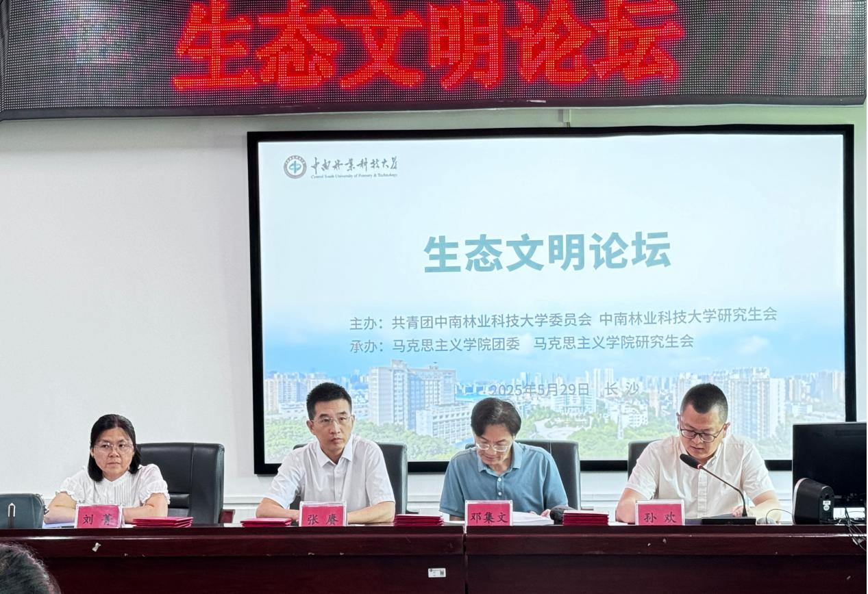2025年5月29日下午14:30,由共青团中南林业科技大学委员会、中南林业科技大学研究生会主办,马克思主义学院团委、马克思主义学院研究生会承办的学术文化节特色活动第002期——“生态文明与绿色发展”学术研讨会在博明楼306顺利举行。马克思主义学院党委书记邓集文、党委副书记张赓、副院长孙欢以及本次学术研讨会获奖者共同出席会议。会议由马克思主义学院团委书记刘菁主持。