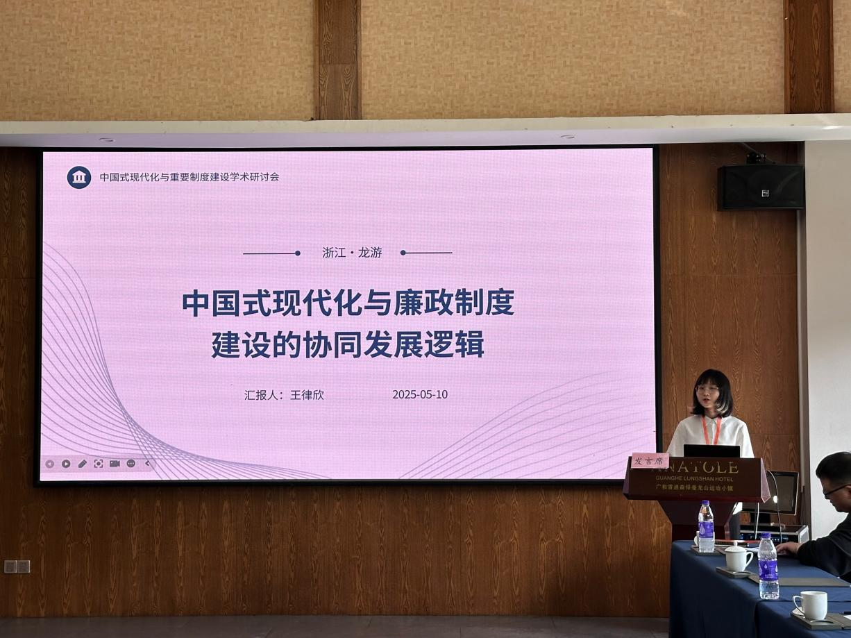 2025年5月10日,由浙江财经大学主办的“中国式现代化与重要制度建设”学术研讨会在浙江龙游隆重举行。来自全国高校的学者齐聚一堂,共同探讨中国式现代化的理论创新与制度实践。中南林业科技大学马克思主义学院硕士生王律欣受邀参会,并作题为《中国式现代化与廉政制度建设的协同发展逻辑》的学术报告。