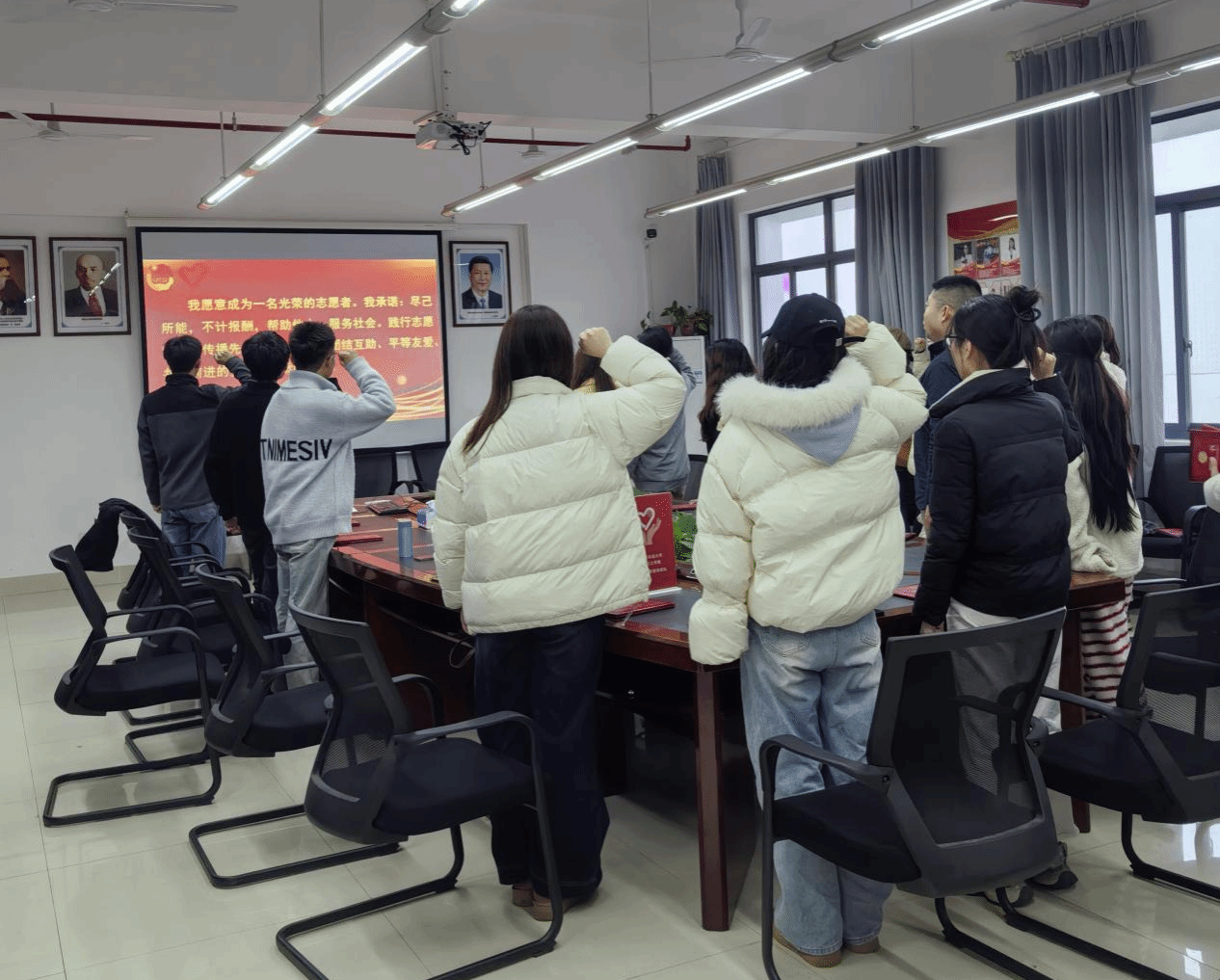 接着,邓书记、刘老师为志愿者团队成员颁发了聘书。随后的志愿者宣誓环节将现场庄重的氛围推向了高潮。志愿服务团队队长身姿挺拔地站在前方,身后是整齐排列的团队代表们。他们目光坚定,满怀热忱,许下对志愿者工作的承诺。这不仅仅是简单的话语,更代表着志愿者们内心深处对奉献社会的执着信念。